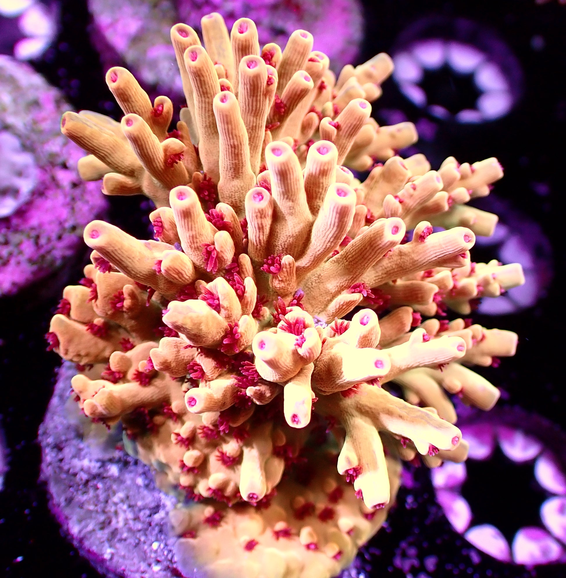 Cream colored smoothie with red polyps. This one is a slow grower, picks up speed once it's about golfball size..