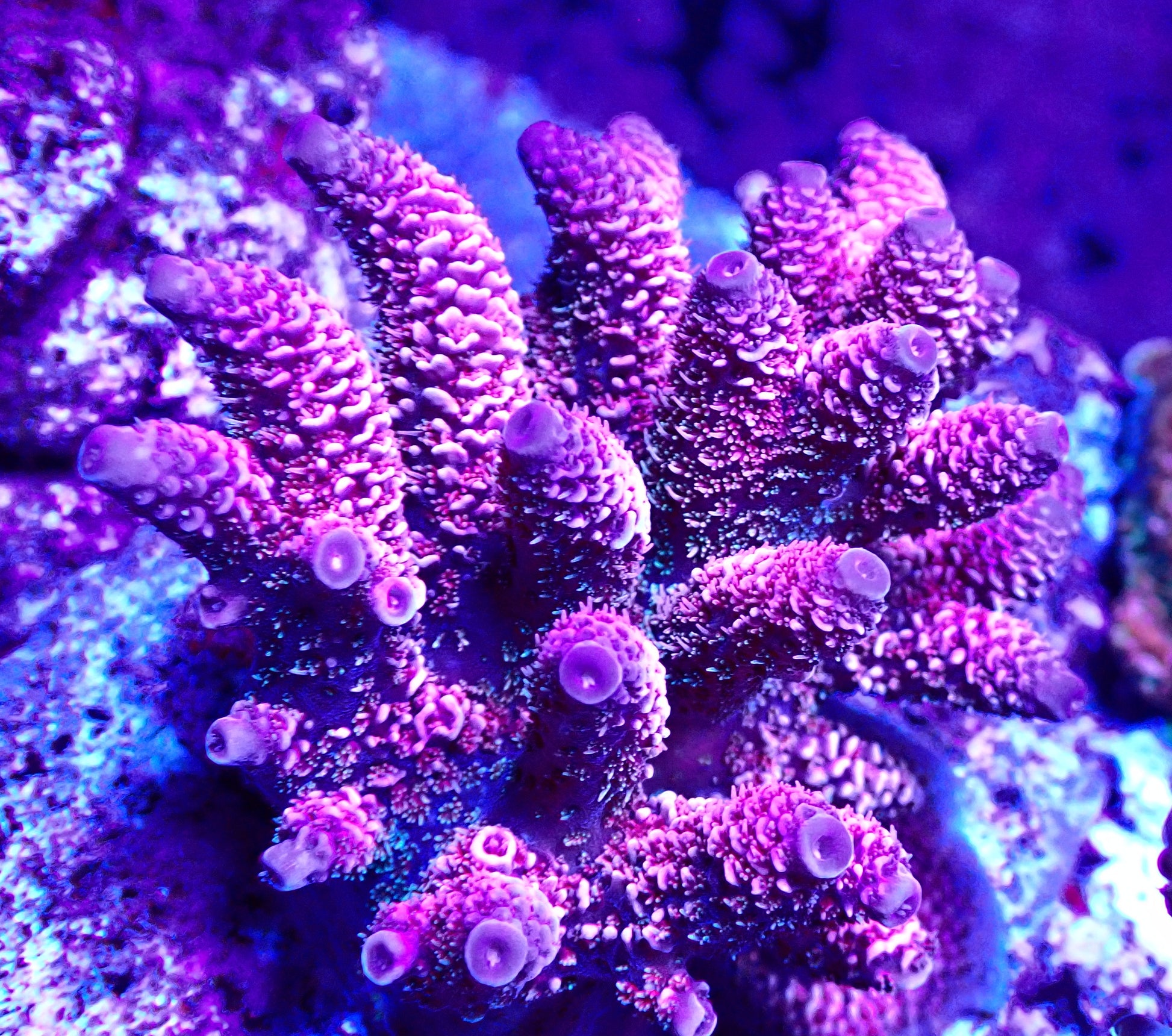 This one is a hard to find gem, an incredible blue spathulata with red polyps