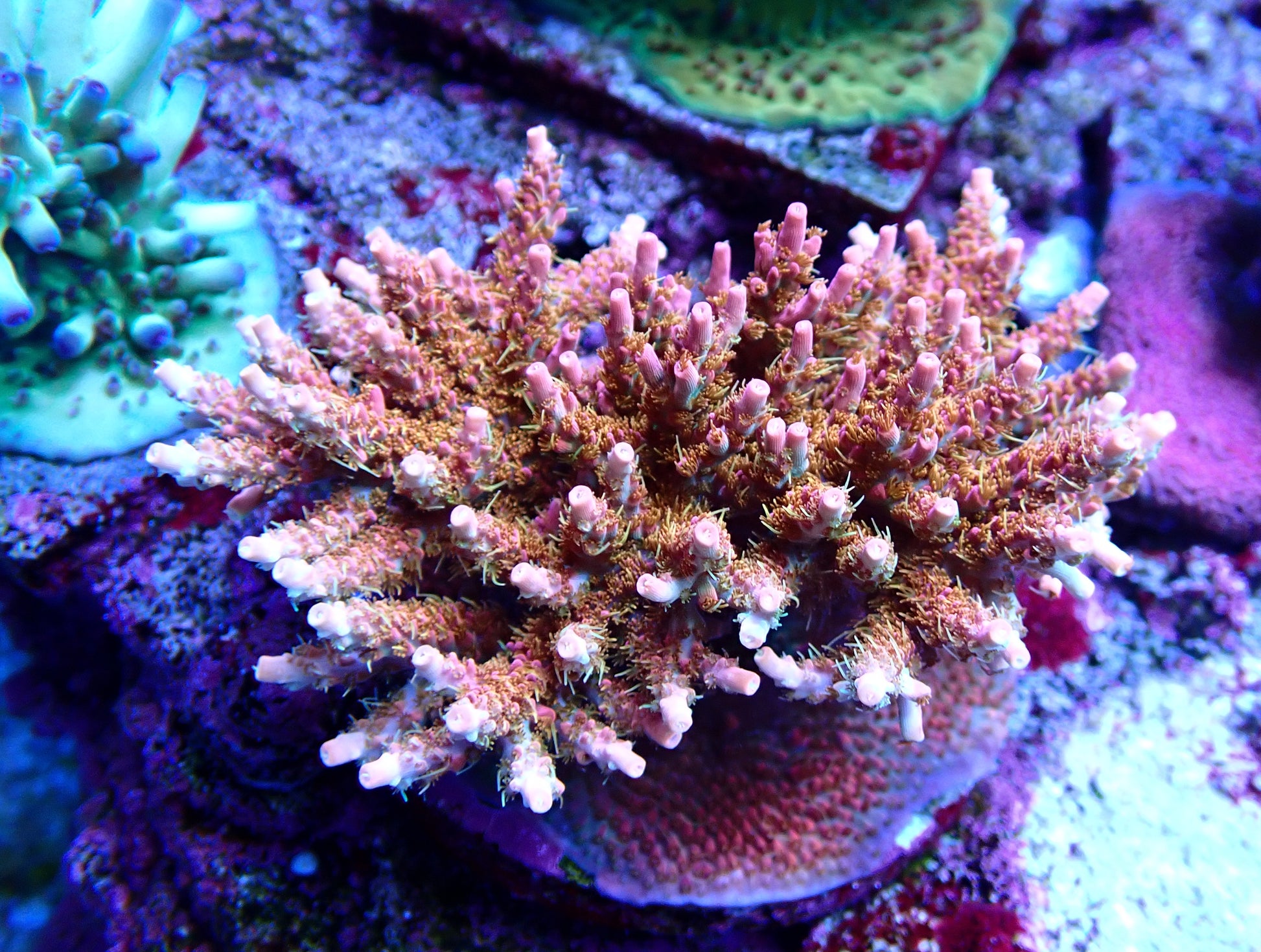 Insanely orange with green undertones and yellow polyps, a tough color combination to beat.