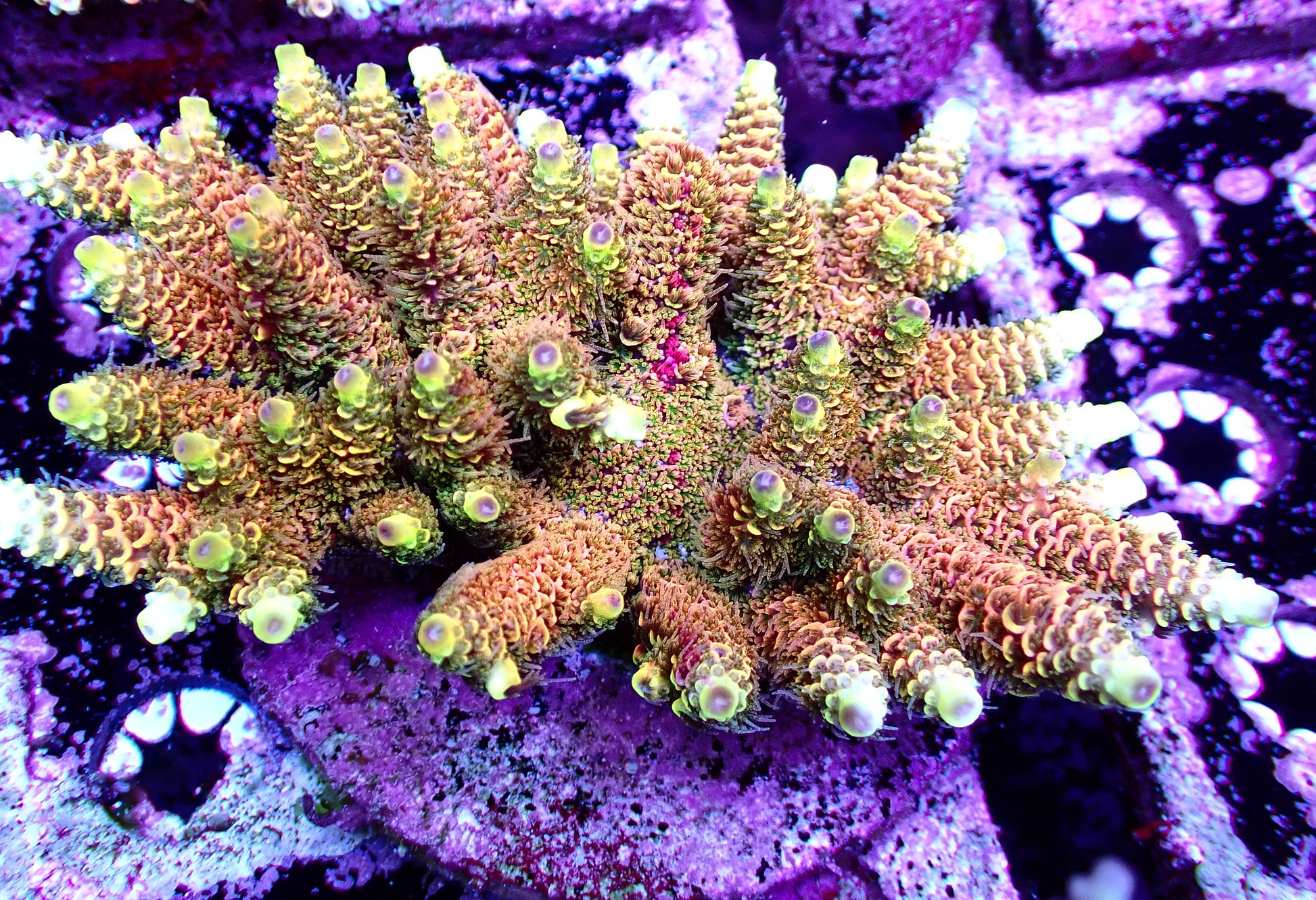 Another must have for millepora enthusiasts. This piece has the potential for all green branches to later develop red pigmentation, but best to start with some red splicing to guarantee dual coloration down the line.